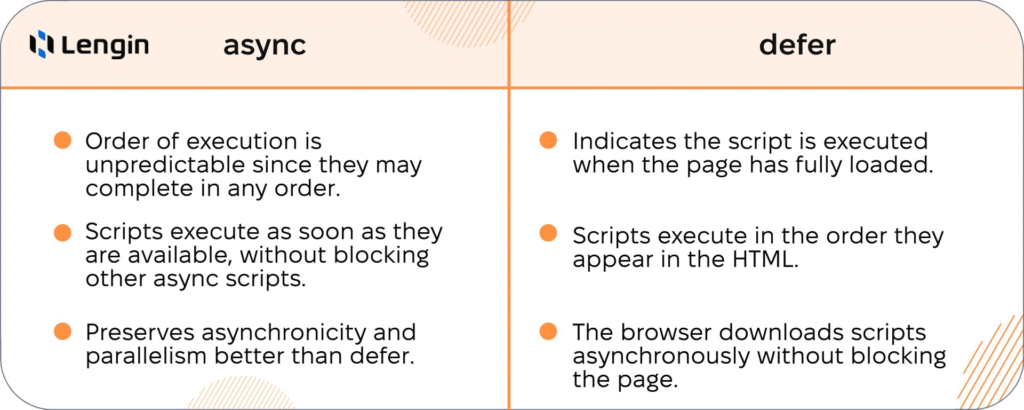 The key difference is that defer executes scripts sequentially after page load, while async provides true parallelism.