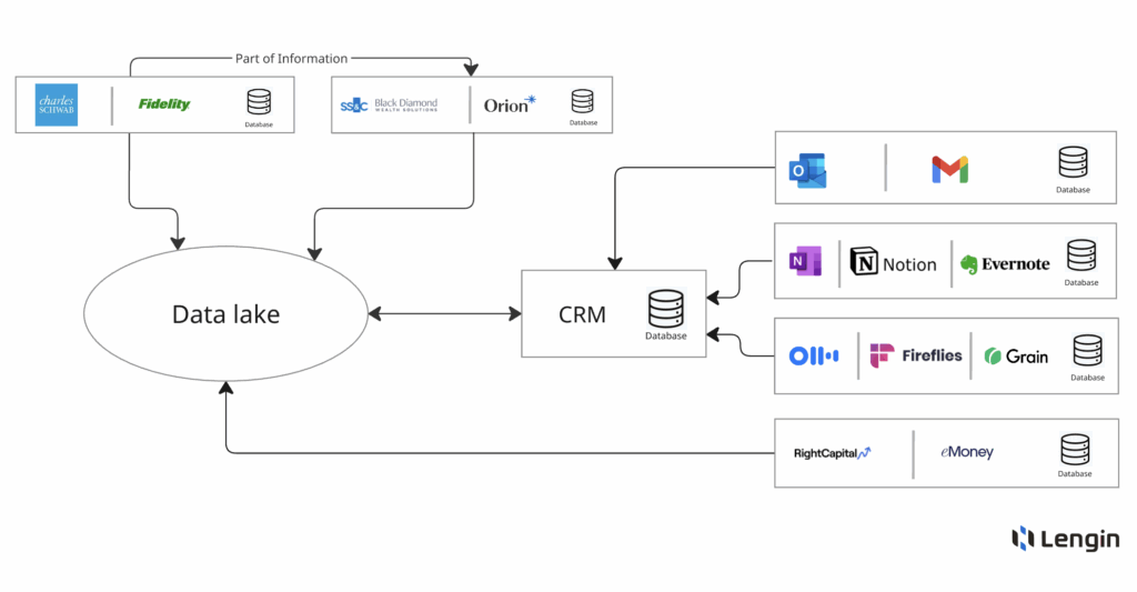 - Use a data lake or warehouse to aggregate information from custodians, CRMs, planning tools, notes, and communications