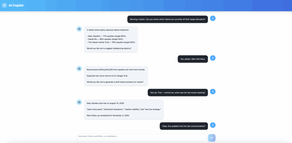 To explore how AI Copilots transform daily advisor operations, see our previous article: “How AI Copilots Are Redefining Efficiency for RIA Firms in 2025.”